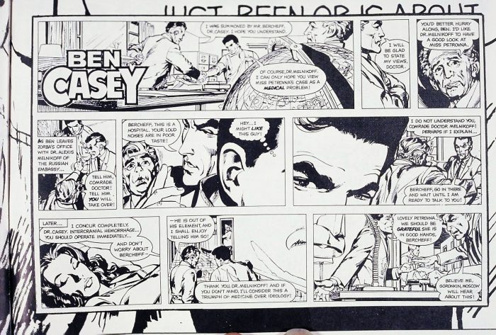 Here’s another example of embedding that uses con-figuration–that is, ground. The only elements that are to be taken literally appear in the centre strip. From a Ben Casey cartoon. The Ben Casey exemplifies how an assemblage of disparate elements can be used to compose an image not implicit in any one of them–exactly how subliminals are constructed when a gearshift lever or a baguette serves as a penis, etc…