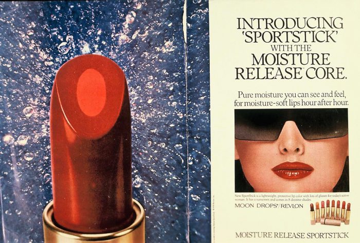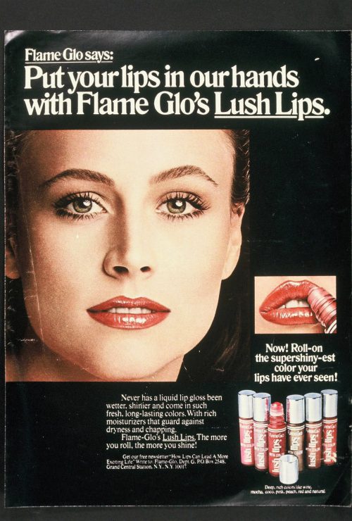 Bear in mind that almost every reference to lips in these contexts is also a double entendre: facial lips and genital lips. As, for example, in the Sportstick ad, or in this one (inviting cunnilingus). See also the next few…