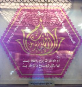 Au centre de recherche Cheikh Zayed : « Le plus grand timbre postal du monde, avec le logo de la ‘Mère des nations’ ». Totalement inutile. J’adore.