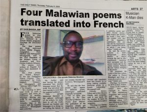 Mes traductions de poésie du Malawi ont été remarquées dans la presse du pays. Le Daily Times a en effet publié le 6 février 2020 un article de cinq colonnes, Four Malawian poems translated into French (Quatre poèmes malawiens traduits en français) par Sam Banda, sur la parution dans le numéro 177 de la revue Florilège, à la section Poètes sans frontières, de deux pages reprenant quatre traductions de mon blog. C’est le poète Beaton Galafa qui a appelé leur attention sur cette publication. Cet article donne la parole à la fois à Beaton et à l’un des poètes traduits, Ndongolera Mwangupili, avec lequel je n’avais aucun contact et qui est actuellement, dit l’article, vice-président de l’Union des auteurs universitaires et scientifiques du Malawi (Malawi Union of Academic and Non-Fiction Authors).