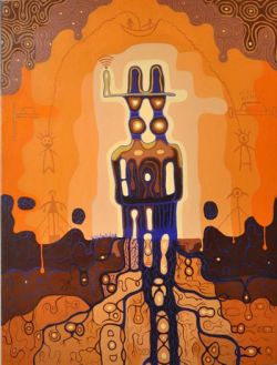 Nudsugana comunicándose con los aliados (Nudsugana communiquant avec les Alliés), tableau du peintre kuna Oswaldo De Leόn Kantule illustrant un thème de la cosmogonie kuna (Source: sagapanama)
