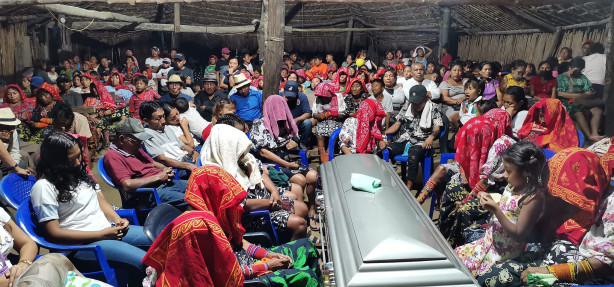 Veillée funèbre autour de la dépouille d’Aiban Wagua à Gunayala. (Photo du compte Facebook du Congrès général guna, Onmagged Dummad Gunayala, avec la légende suivante : « El último adiόs al Dr. Aiban Wagua. Ogobsuggun, Gunayala. Estos momentos se realiza el acto de homenaje en tributo del Dr. Aiban Wagua. Sagladummagan, Rengifo Navas, Aniba Sánchez y Domitilio Morris participan a nombre de los máximos organismos de Gunayala. 14/09/22 »)