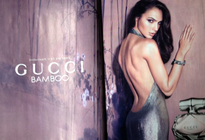 On the left page of this two-page advert for perfume, you can see, beside the name of the brand and the copy (“Underneath it all she wears Gucci Bamboo” – this by itself is eroticism, isn’t it?), a Japanese-like ink print, complete with birds in bamboo trees and grass by a river. The river stream and grass stand for a moist, oozing vaginal slit with pubic hair.