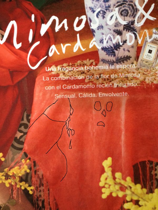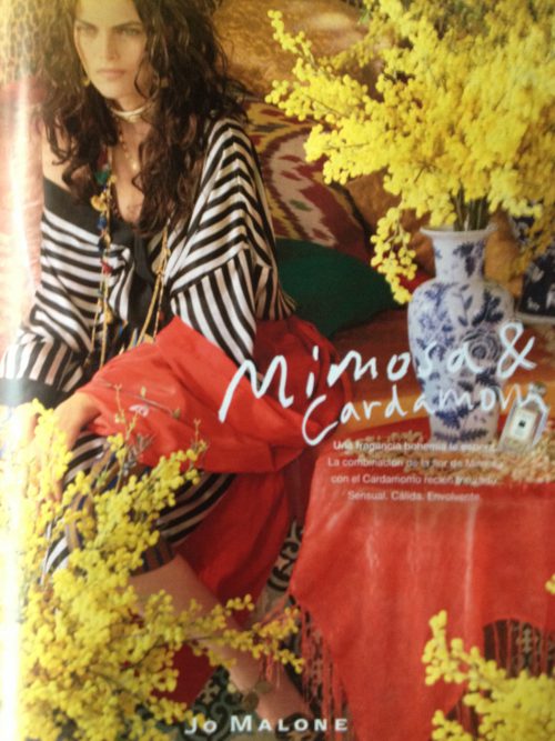 The copy says that the combination of mimosa and cardamom is “sensual, warm and enveloping.” Fine. Now, strangely, part of the tablecloth is hooked to, I don’t know for sure, either a branch of mimosa or the model’s ankle just behind it (more likely the branch, however). This, in my opinion, is completely crazy. How could the advertisers overlook such a blunder? Couldn’t they just disentangle the tablecloth from the plant or the model’s ankle bracelet before taking the picture? How much were these incompetent fools paid for the shot?
