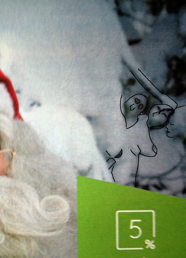 Travelkids organizes travels and sojourns “for the family.” Yet, in case you would find it a bit trite, they suggest you may find more excitement than just that. I am not talking about the meeting with Santa Claus, which is the copy line, but of the subliminal embed in the background. A woman is laid with two men. One man is lying beneath her; you can see his face, looking at you, between her right thigh and her right breast. The other man’s face is against her face. I have also outlined what seem to be a stretched arm and a hand resting on the woman’s head, hinting at the possible presence of a third man. The man beneath the woman is penetrating her in the anus (picture 91-3). The vaginal slit may be stuffed with a penis too, if you look carefully, but I have not outlined this because I’m not so sure there.
