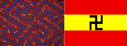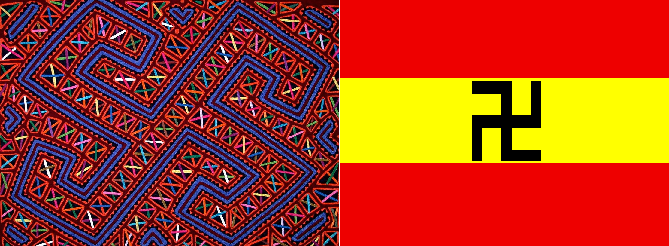 Motif en forme de svastika d’un mola (tissu) des Indiens Kuna de l’archipel de San Blas au Panama. A droite, drapeau en usage dans l’archipel de San Blas depuis l’autonomie de 1925 jusqu’à nos jours. Le svastika est un symbole utilisé par de nombreuses ethnies amérindiennes.