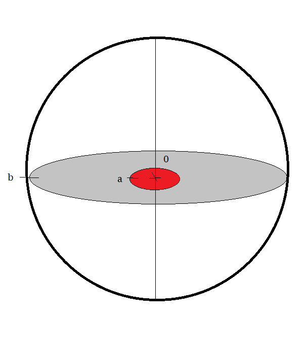 Le schéma ci-dessus (réalisé avec les moyens du bord) est une représentation graphique du sens qu’a selon nous le passage. Il s’agit d’une sphère de centre 0 tournant dans un mouvement de rotation autour d’un axe vertical passant par 0. Un plan de coupe de la sphère en son milieu dessine un cercle grisé : de tous les cercles concentriques de ce même plan, le cercle gris est celui dont le périmètre est le plus grand, correspondant aux limites de la sphère et de même rayon que celle-ci. Un cercle concentrique plus petit est le cercle rouge ; son périmètre peut être de n’importe quelle valeur entre 0 (pour un rayon de 0, donc) et la valeur du périmètre du cercle gris.