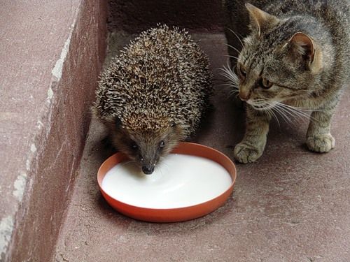 Picture: Lactose-intolerant hedgehog and cat sharing a cup of milk. I’m not saying biologists are wrong but… it’s bluffing.