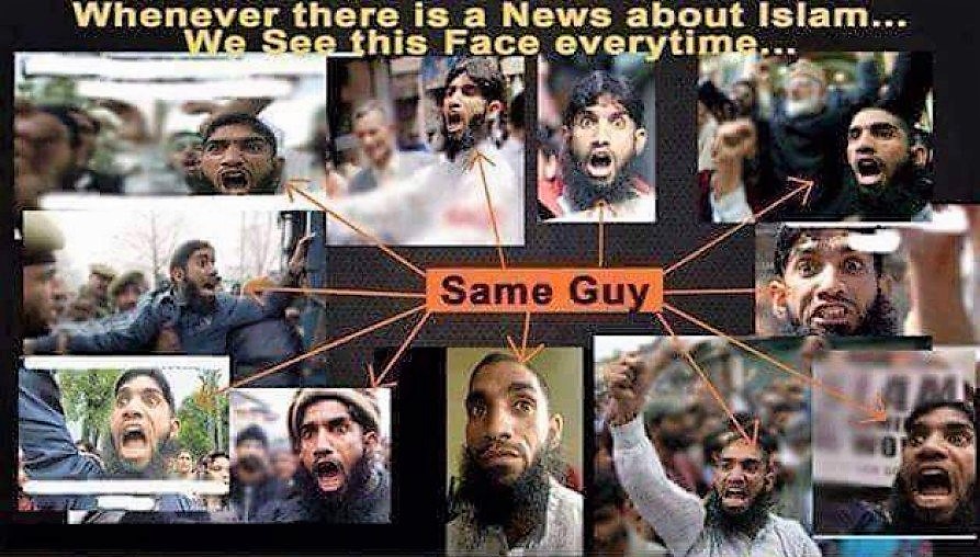 Look at ubiquitous Islamic Rage Boy compared with Muslim protesters around him. He’s a scam. Islamic Rage Boy has been selected by his paymasters (Mossad or others) for his ugly, alarming grimaces.