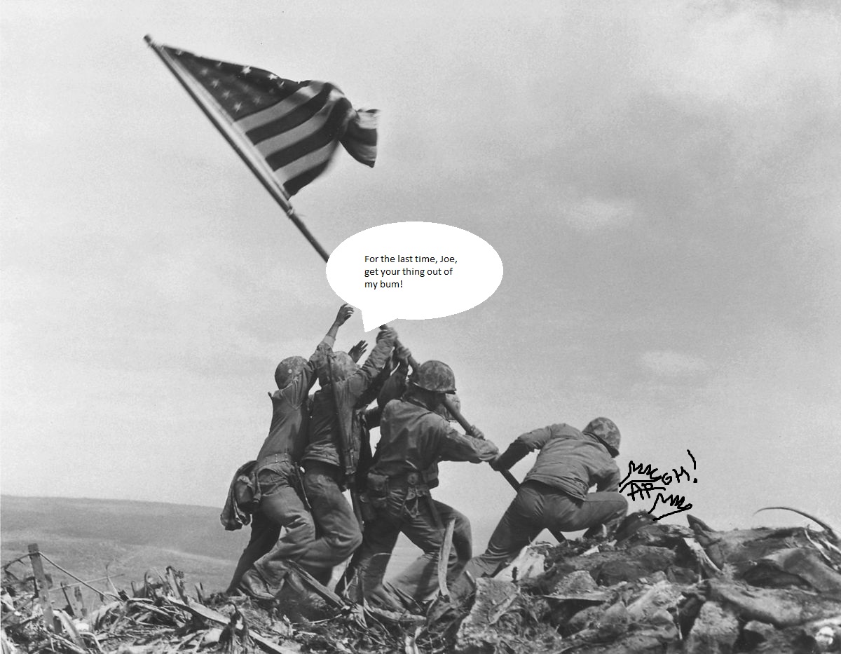 Five soldiers needed to raise a flag… and yet they only see the front man’s buttocks. American perverts.