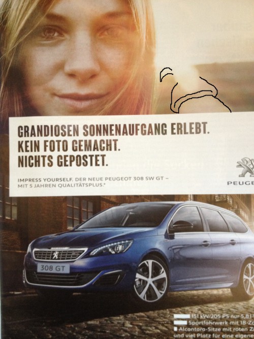 An advert for the French car manufacturer Peugeot. The copy is strictly insignificant although I doubt not some public relation men from the advertising milieu would easily extol its merits to a credulous public. What I want you to see is the penis ejaculating on the model’s face. The penis, namely the glans with a well-delineated coronal ridge, as well as the upper part of the shaft, are visible in the guise of sun beams. Part of the glans is covered by a brighter spark, which could represent semen flowing on the glans due to the peculiar position or movement of the penis during an earlier spurt (or else it could be a way to conceal that disturbing penis to consciousness). At the present moment, a fraction of second after the earlier spurt, another spurt is projected through the meatus toward the model’s cheek, or hair, on the left. The copy is now more meaningful. ‘Impress Yourself’ by submitting young girls to your sexual fantasies thanks to being the owner of a Peugeot car. Facial ejaculation is indicative of female subjection (cf. H. J. Eysenck).