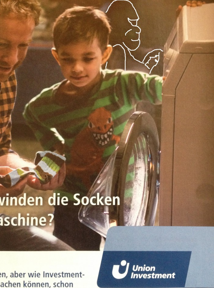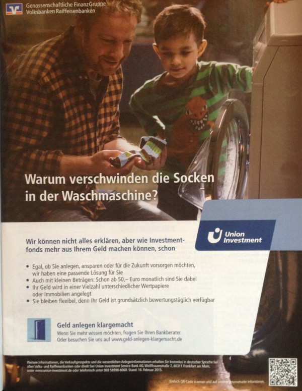 The copy, in German, says ‘Why are socks always disappearing from the washing machine?’ and we see a father and his son wondering at their finding only one sock from a pair among the washing. The copy further says that, although we cannot explain everything, at least having one’s savings at Union Investment (the investment branch of Deutsche Zentral-Genossenschaftsbank) is a safe and transparent option, liable to no unpleasant surprise. I leave it to you whether this is a fine, clever advertisement so far as the preceding is concerned.