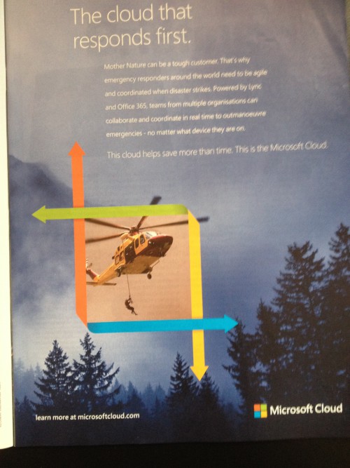An advert for Microsoft Cloud from the same campaign as here. The green arrow ends in a cloud. The cloud shows a woman’s face. She has the arrow in her mouth and seems to enjoy it. If you think I am seeing imaginary things in clouds, please let me remind you that the cloud here is not a cloud in the sky but a cloud in an ad, and that makes a big difference. I can admit there is no God or gods sending intricate signals to us humans through clouds’ shapes, but the graphic designer of this ad is a human being like you and me – with that difference that he or she probably earns a lot more money, because the ad having being published in major papers and magazines around the world the campaign must have been immensely expensive, and the advertiser remunerated in consequence.