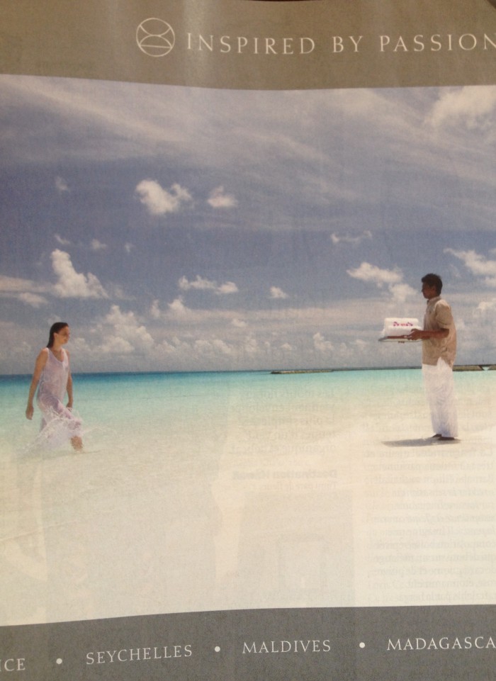 The lady is coming back from her bath in the sea toward the beach, where an attendant from the hotel is waiting with towels. How long has he been waiting? Is this really how employees attend to customers in Constance hotels and resorts? Is the customer offered a return to the old days of footmanship, when lackeys were at their master’s disposal night and day? Be that as it may, there is more to find in Constance hotels and resorts. The lady looks determinedly and eagerly at the local employee’s face. She wears a sort of nightdress, and that seems rather strange for sea bathing. As I can see no nuance in colors indicative of a bathing suit under that dress, and as the dress being white it has by necessity become transparent due to immersion in water, the lady is actually exhibiting herself to the employee facing her. In particular, her pubic hair must be conspicuous. Furthermore, if she is intent on using the towels, that will prove a futile exercise unless she removes the wet gown, that is, unless she undresses in front of the man. That the advert is coarse eroticism is not to deny. Why should it be called subliminal at all? It’s coarse, it’s vulgar, it’s in your face (not tongue in cheek), and it occurs while you may be under the fancy that you do your duty as a respectable member of the society by keeping informed of the news.