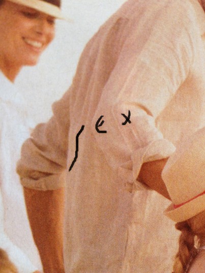 The sex embed is on the denim shirt. As far as I can see, there are a couple more Xs around that could provide the third letter. If you observe the cases well, you will find it is not unusual that some parts of the photographs are covered with graffiti, clouds of letters.