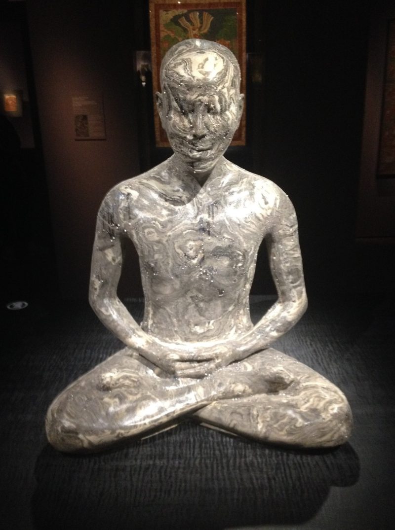 Dans la salle d’après, les œuvres exposées sont à base de recyclage de matériel informatique. Je remarque en particulier une figurine d’homoncule sous perfusion de câbles d’ordinateur par lesquels il est alimenté et maintenu en vie. Avant de passer à la salle suivante, je regarde en arrière dans l’enfilade des pièces pour voir si A. et l’autre ont avancé, mais je ne les vois pas.