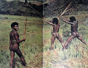 Chasseurs papous. J’admire la taille des flèches. A noter également l’étui pénien du Papou de gauche. (Source: La Genèse de l’homme, J.S. Weiner, 1972, Editions Rencontre, Lausanne)