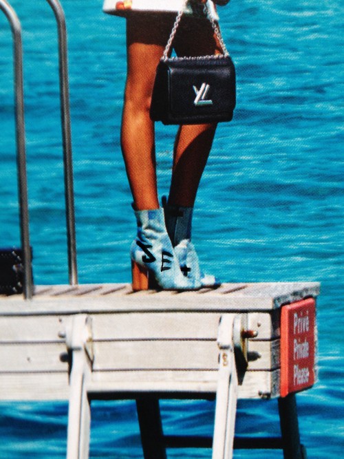 The lady is waiting on a pier with an extravagant profusion of luggage. The sex embed is on her boots. The signal on the tip of the pier reads ‘Privé Private Please.’ ‘Privé’ is the French for ‘private.’ Zooming on the board, you realize these words are not the first of a phrase, like “private pier”; they stand alone on a meaningless board. A private pier, however, conveys the idea of VIP-ness, and the advertisement as a whole the idea that very important people consume very much.