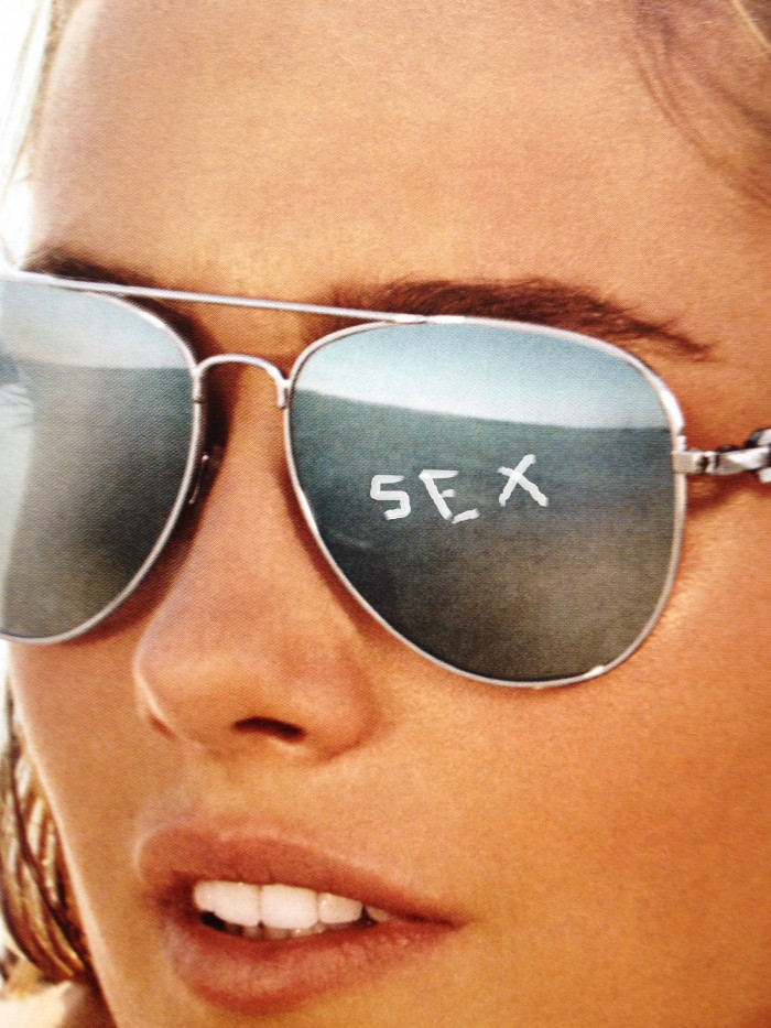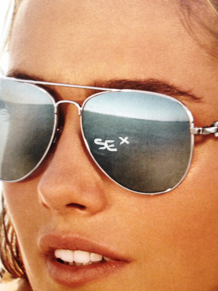 As in Case 15 (here), the word sex is embedded as a reflection on the sunglasses. Such reflections are typical background elements to which no attention is paid, even if geometrically speaking they are not in the background at all (since they are even closer to the viewer than the face itself, the glasses protruding from the forehead).