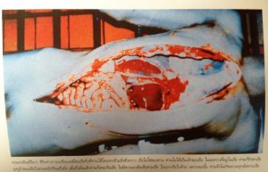 Let me now introduce you to a meditation practice of Theravada monks, namely the meditation on the nature of our body. Such booklets as the one I got in a Bangkok temple during a temple fair a few years ago are destined to assist such form of meditation through their pictures. The book’s title is Considerations on the Body and its cover displays an image of the Emaciated Buddha (Pra Pom: look here). It displays photos on which to meditate, together with thoughts of Buddhist philosophy. I enclose a few of these pictures.